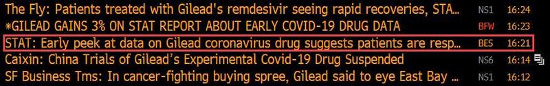 They did just that at 430pm today when the low profile Statnews published a report by Adam Feuerstein, best known for doing the bidding of one or more hedge fund clients, according to which a “Chicago hospital treating severe Covid-19 patients with Gilead Sciences’ antiviral medicine remdesivir in a closely watched clinical trial is seeing rapid recoveries in fever and respiratory symptoms, with nearly all patients discharged in less than a week, STAT has learned.”