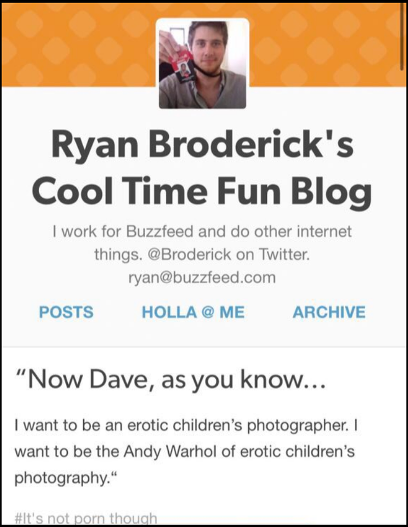 Perhaps even more disturbing, however, are several posts uncovered on “Ryan Broderick’s Cool Time Fun Blog,” along with questionable tweets and other writings as documented by internet sleuths in the wake of our Twitter suspension. They include pedophilia, rape jokes, and more.