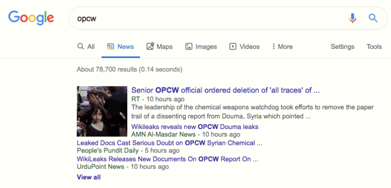 As of this writing, a Google News search for this story brings up an article by RT, Al-Masdar News, and some entries by alternative outlets you’ve almost certainly never heard of like UrduPoint News and People’s Pundit Daily.